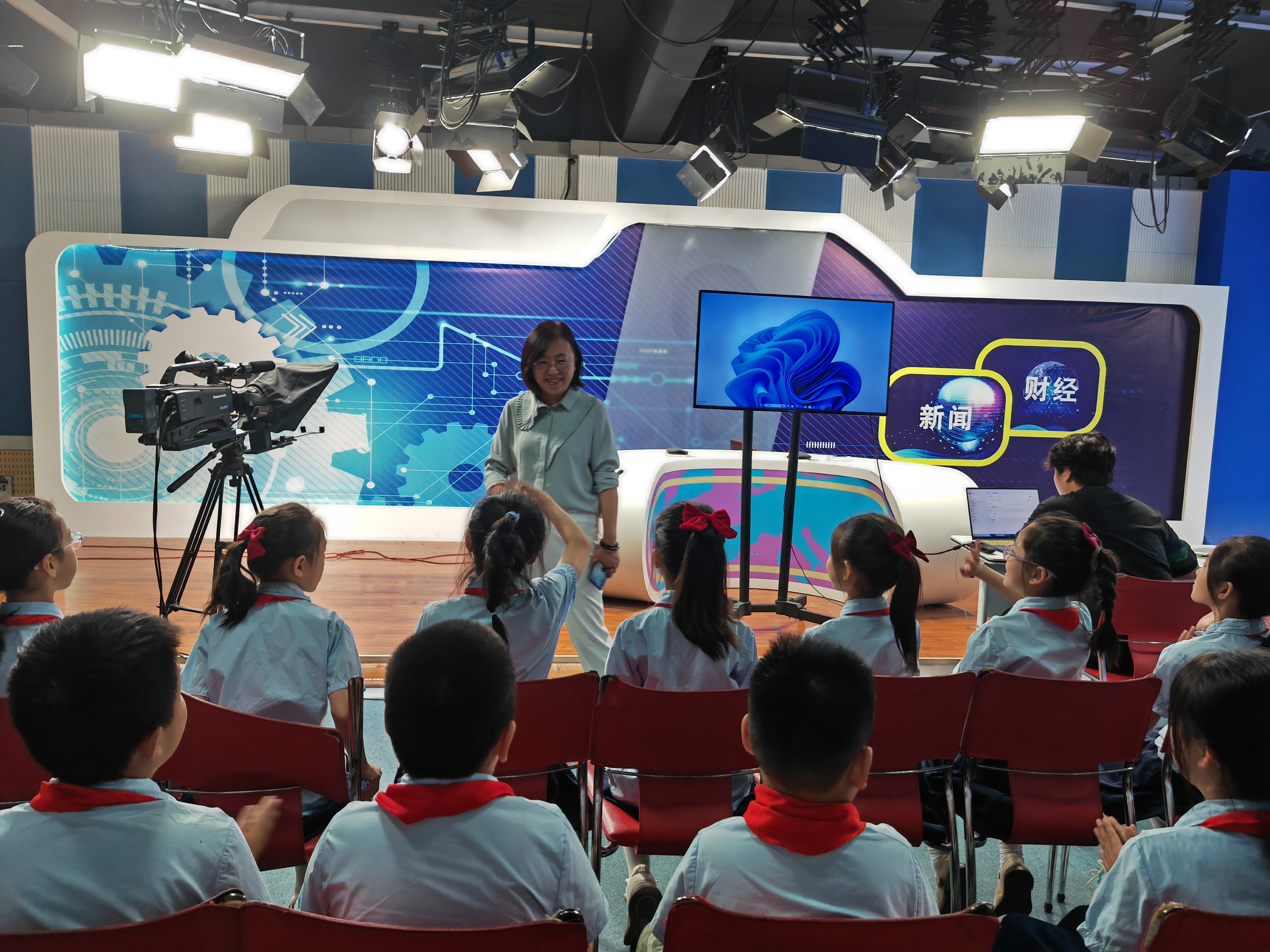 在活动现场,信阳职业技术学院91成人网站学生党支部优秀党员带领小学生们参观了融媒中心演播厅,了解了广播电视节目的制作流程。