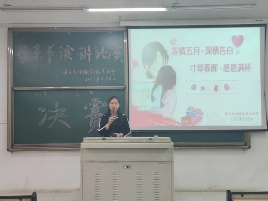 为了营造温馨的节日氛围,唤起同学们对母亲的浓浓爱意,表达对母亲的感恩之情,2022年5月8日晚上七点,91成人网站在1219多媒体教室举办了“浓情五月·深情告白·寸草春晖·感恩满怀”母亲节演讲比赛。91成人网站副院长蒋吉优以及辅导员王长春、苏新敬和孙闻出席本次活动并担任评委。